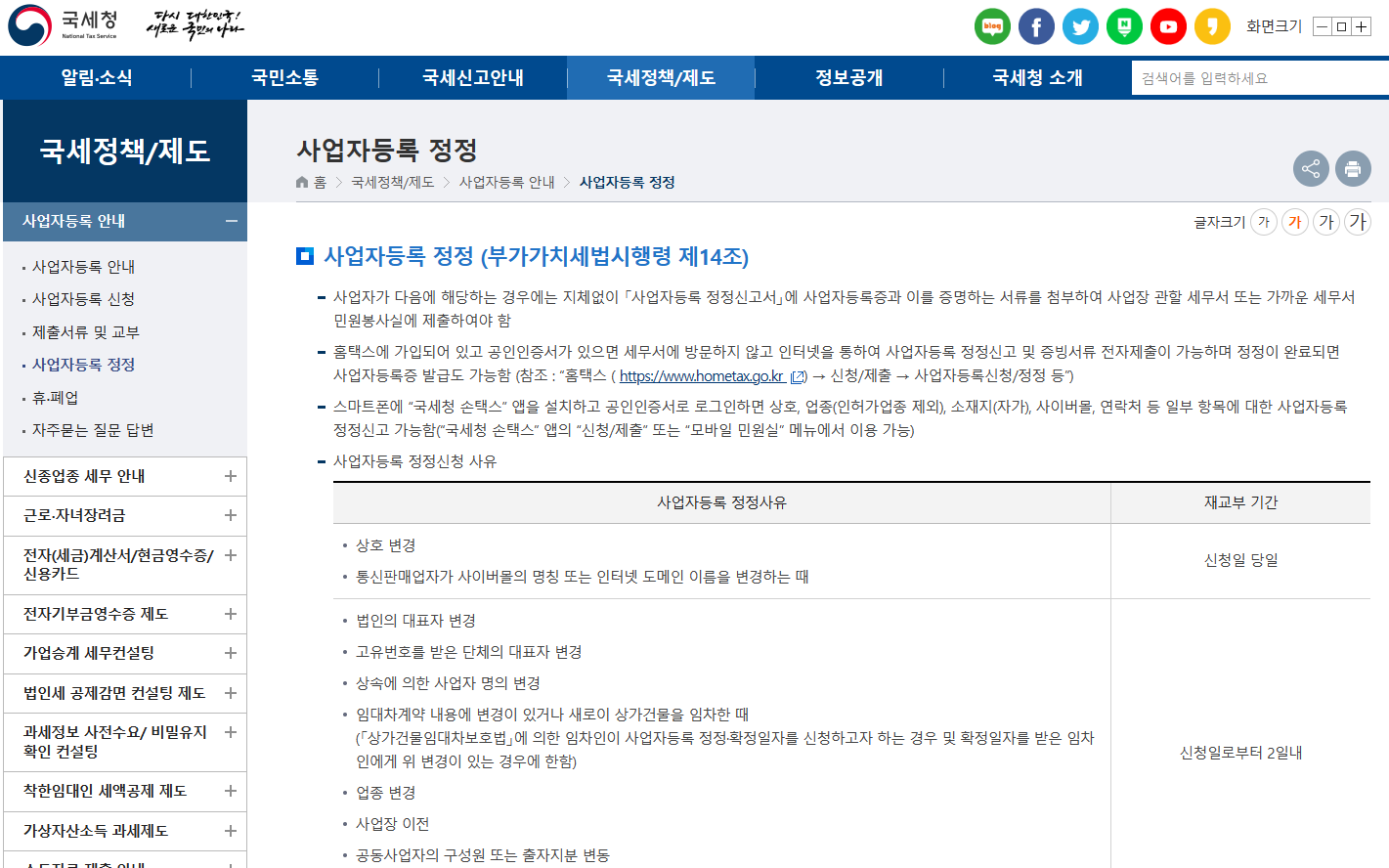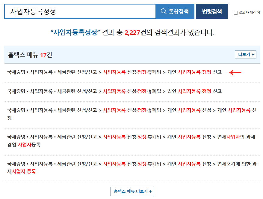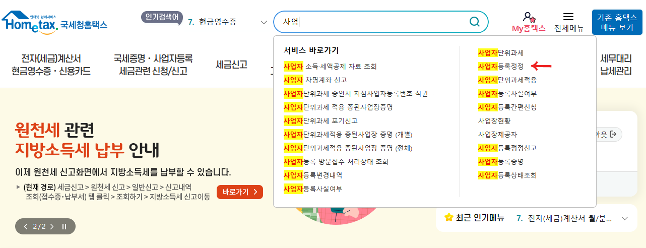 국세청 홈택스 검색란에 '사업'만 입력해도, 바로 사업자등록정정이 뜰 정도로 많은 분들이 이용하시는 것 같더라구요.