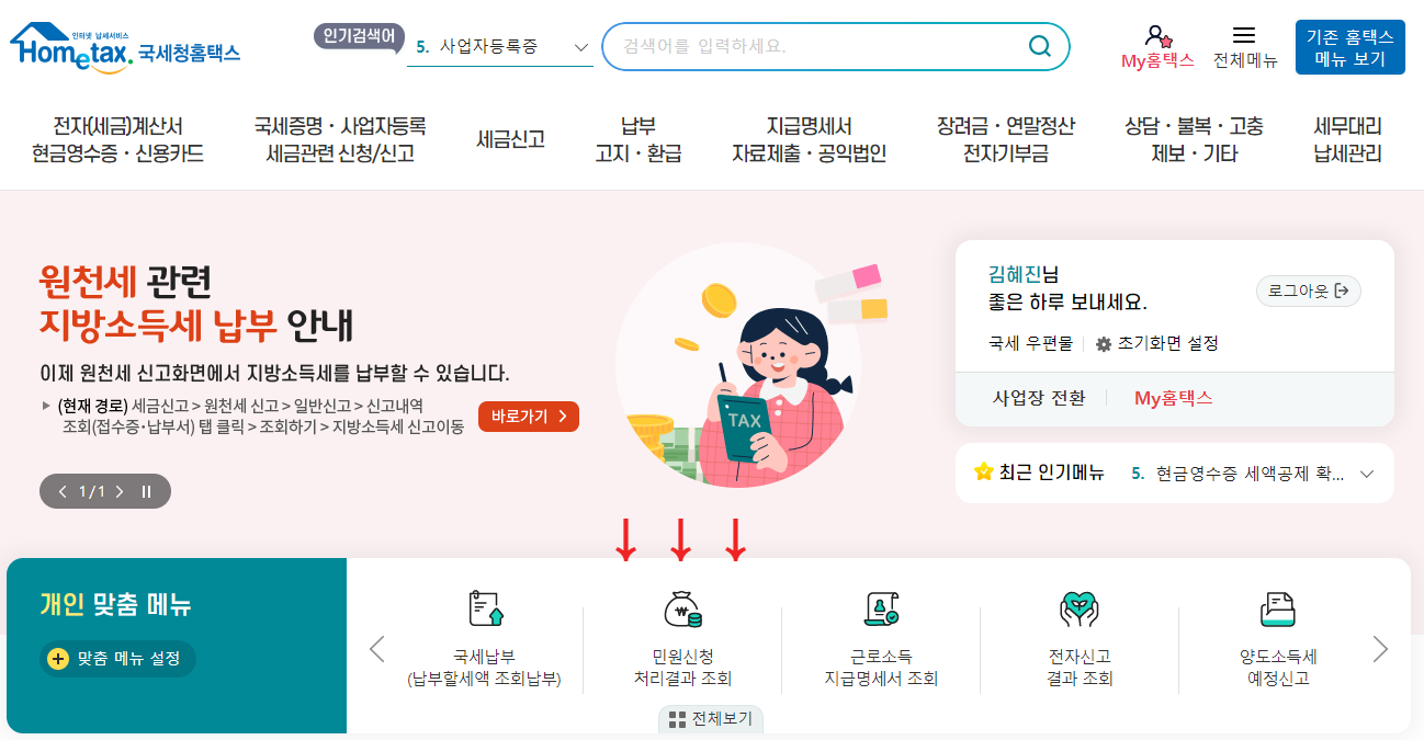 홈택스에 들어가면, 화살표로 표시해둔 '민원신청 처리결과 조회'라는 버튼이 있는데요.