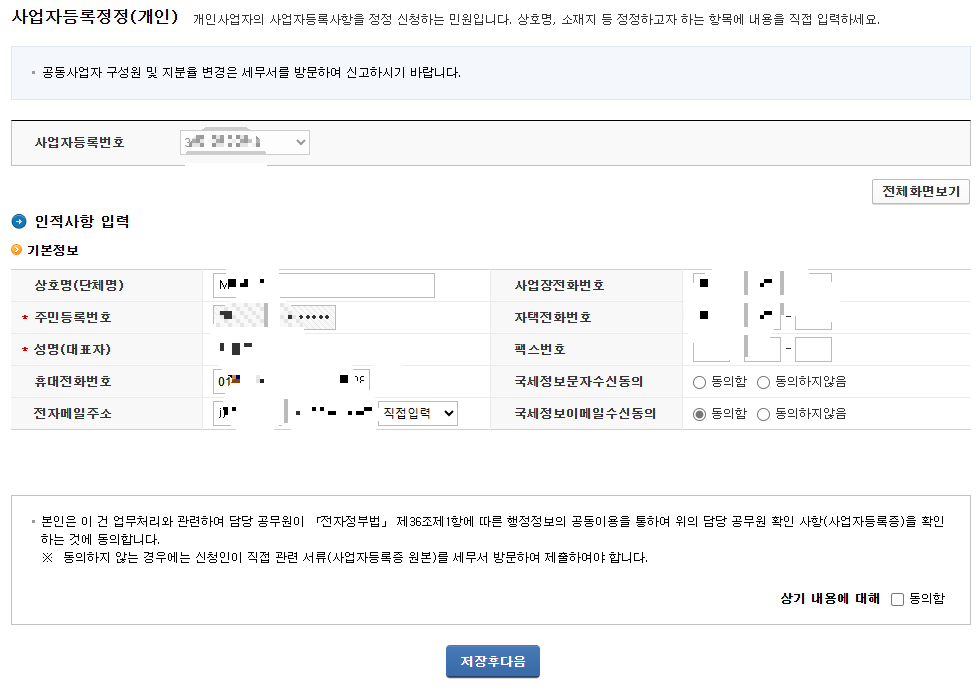 상호명 부분을 변경한 다음, 나머지 부분은 사업자등록증과 동일하게 다시 작성했어요. 그리고 [동의함] 버튼을 클릭하고 [저장 후 다음]을 클릭해주면 끝!