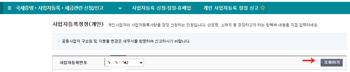 2. 국세청 홈택스에서 '사업자등록정정' 검색