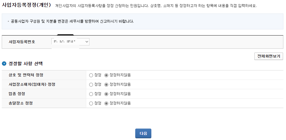 사업자등록정정 항목에서는 1) 상호 및 연락처 정정, 2) 사업장소재지(임대차) 정정, 3) 업종 정정, 4) 송달장소 정정이 있는데요. 제 경우 상호명만 수정을 할 예정이었어서 1번만 정정으로 하고 [다음]을 클릭했어요.