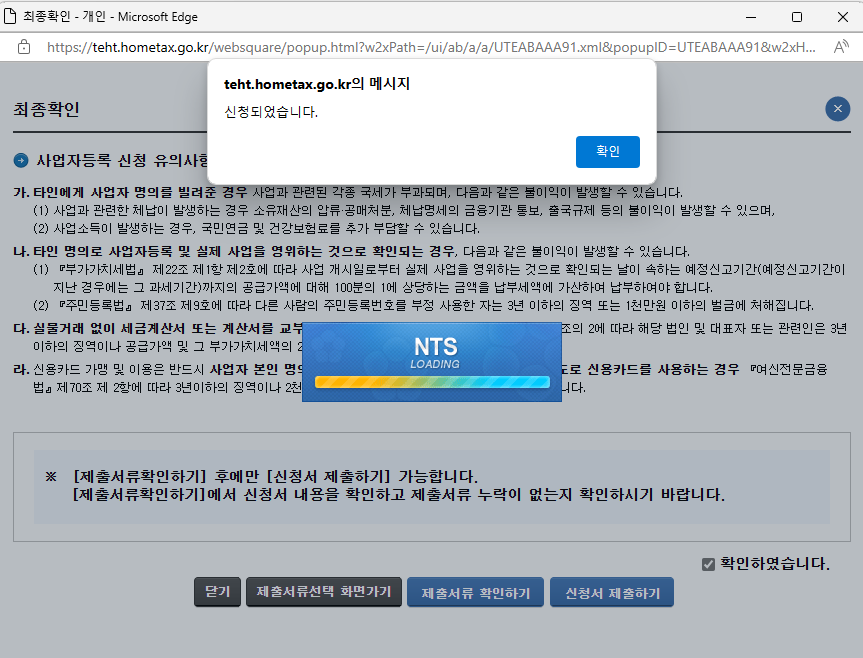 새로운 사업자등록증 발급을 위해, 홈택스에 다시 로그인