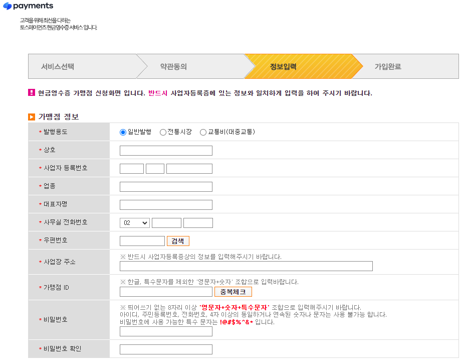 그리고 가맹점 정보 등을 사업자등록증에 있는 정보와 일치하게 입력해주세요.