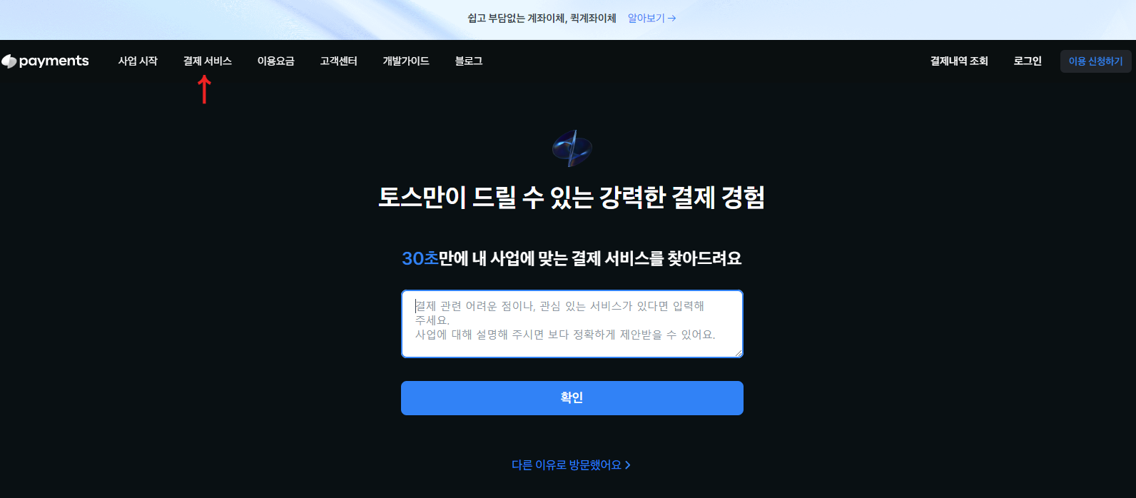 토스 웹사이트로 들어가신 경우에는, 화면 상단의 [결제 서비스] 부분을 클릭해주시면 메뉴 탭이 나오는데요.