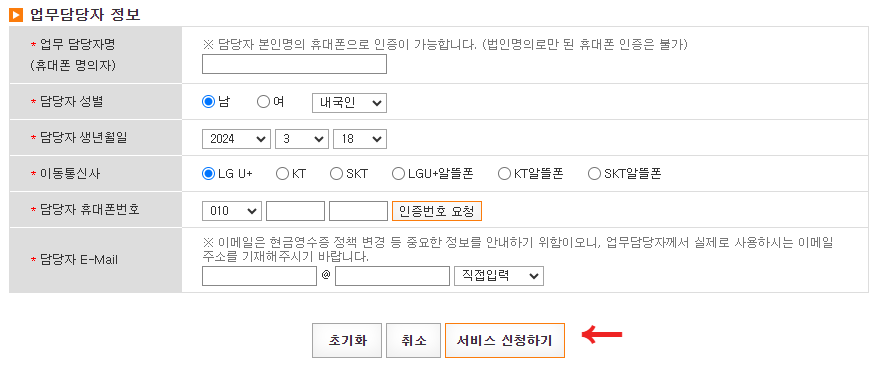 그리고 업무담당자 정보까지 입력하면 끝!