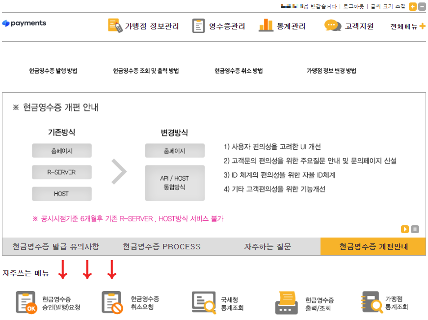 로그인을 하면, 자주쓰는 메뉴에서 현금영수증 승인, 취소, 그리고 출력/조회 등등 필요한 메뉴가 모두 생성되어있어서, 메뉴에서 따로 찾을 필요 없이 바로 처리할 수 있는게 정말 편리한 점 중 하나에요.