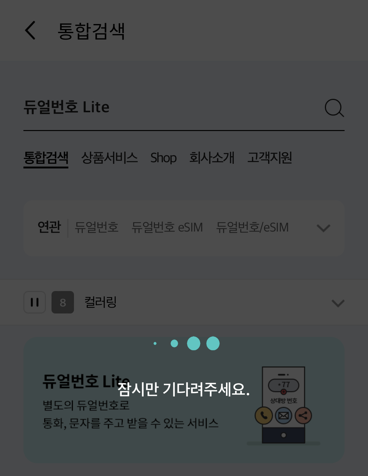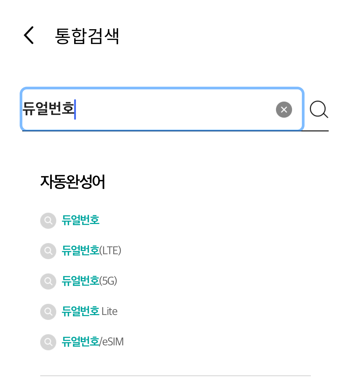 마이케이티 메인 화면의 우측 상단을 보시면 돋보기 아이콘이 있는데요. 이 버튼을 클릭해서 통합검색을 이용할 수 있어요. 저는 듀얼번호로 검색하니 자동완성어로 '듀얼번호 Lite'이 바로나오더라구요.