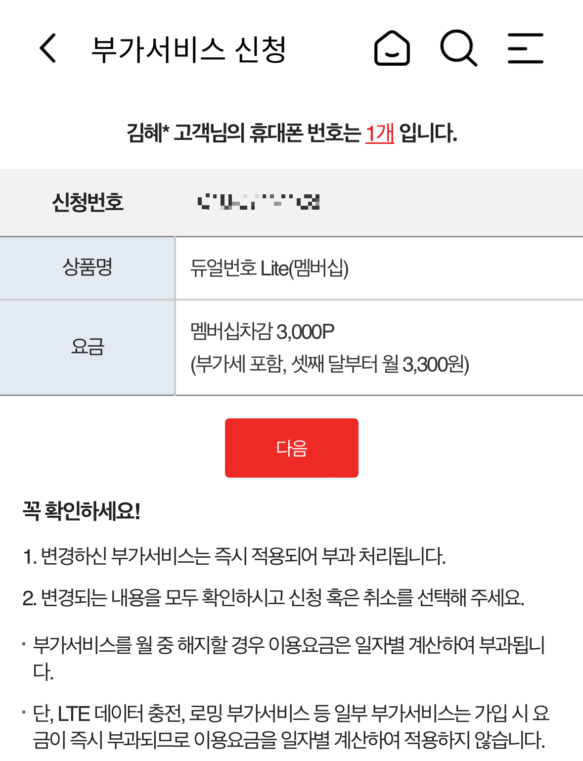 부가서비스를 추가하는 개념으로 손쉽게 듀얼넘버 세팅 끝!