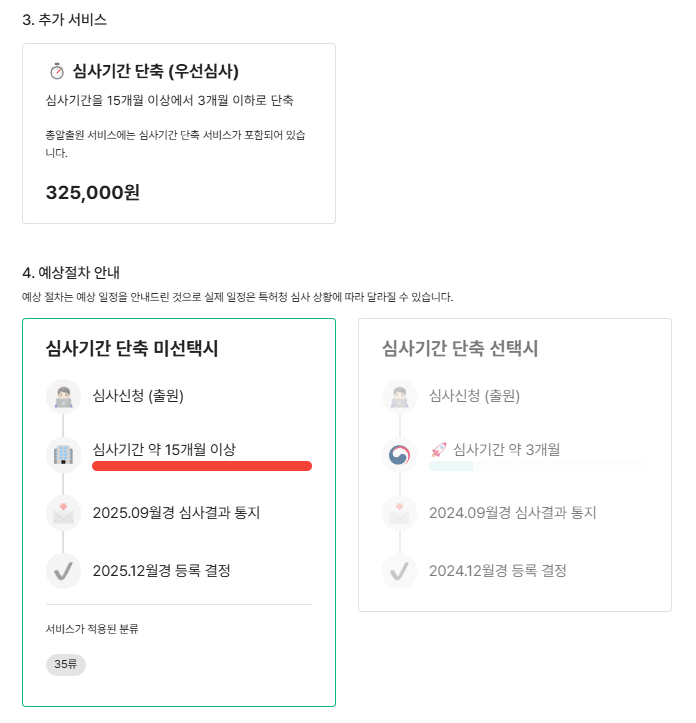 마지막으로 총알출원은 빠르게 상표출원을 진행하는 건데요. 기본적으로 심사기간이 15개월은 걸리는데, 이걸로 진행하면 3개월 만에 빠르게 등록이 가능하다는 장점이 있어요. 대신 가격은 249,000원이라 특허청 관납료 포함 479,900원이라 상표권등록비용이 가장 비싸요.