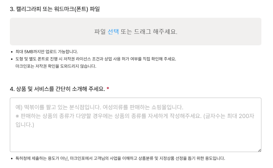 저는 텍스트 형태의 로고 파일이 있는 상태라 로고파일을 올렸고, 상표의 목적에 대해 간략하게 소개했어요. 담당자님께서 상표에 대해 참고하실 수 있게 작성해주시면 돼요.
