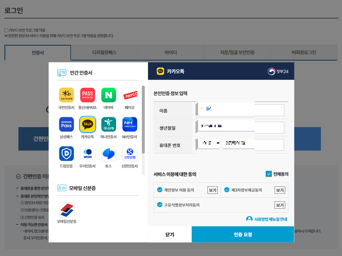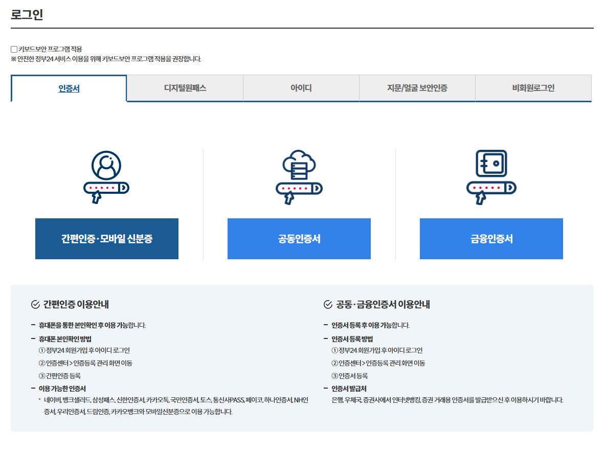 디지털원패스나 아이디, 지문/얼굴 보안인증, 그리고 비회원로그인을 하는 방법도 있으니 참고하세요 :)