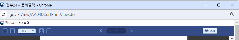 문서출력을 클릭하면 이렇게 화면이 뜨는데, 우측 상단의 [인쇄] 버튼을 클릭해주시면 PDF로 저장할 수도 있고, 바로 인쇄를 진행할 수도 있어요.