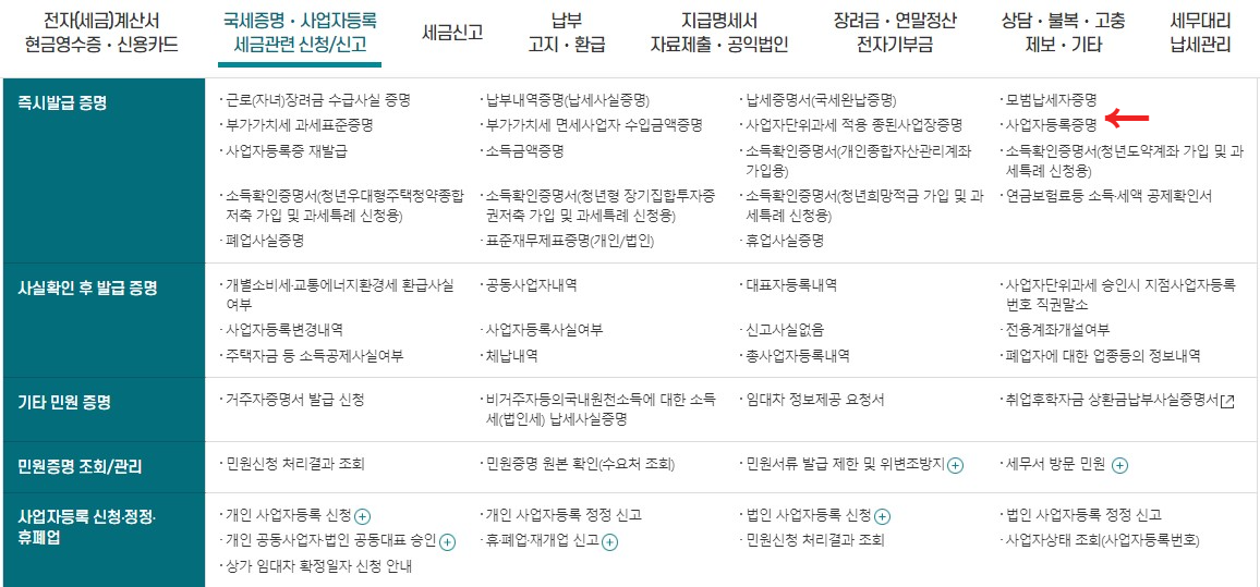 위의 이미지에 빨간색 화살표 보이시나요? [즉시발급 증명] 부분에서 최우측 상단을 보시면 [사업자등록증명]이 나오는데, 이 부분을 클릭해서 신청하면 끝이에요.