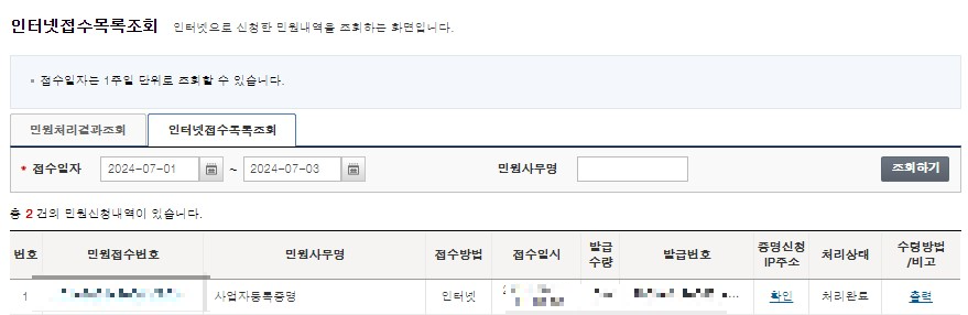 신청하기를 클릭하면 바로 [인터넷접수목록조회] 페이지로 넘어가는데요. 여기에서 '출력' 버튼을 클릭하면 바로 사업자등록증명을 인쇄하실 수 있어요. 저는 영문본이 아닌 한글본으로 신청했는데, 이 부분은 필요에 맞게 신청하시면 돼요.