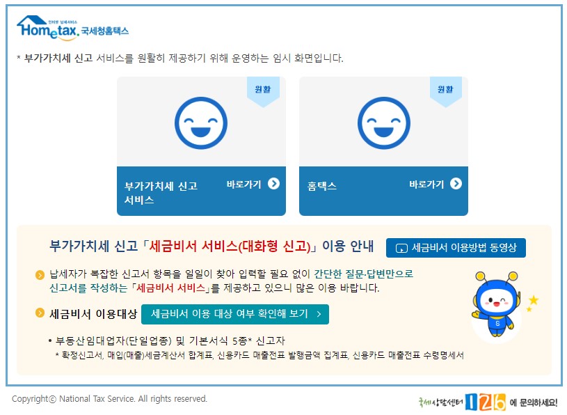 요즘 부가가치세 신고 기간이라 홈택스에 접속하면 이렇게 뜨더라구요. 저희는 민원을 신청해서 사업자등록증명원을 발급받을 거라 [홈택스 바로가기]를 클릭해주시면 돼요.