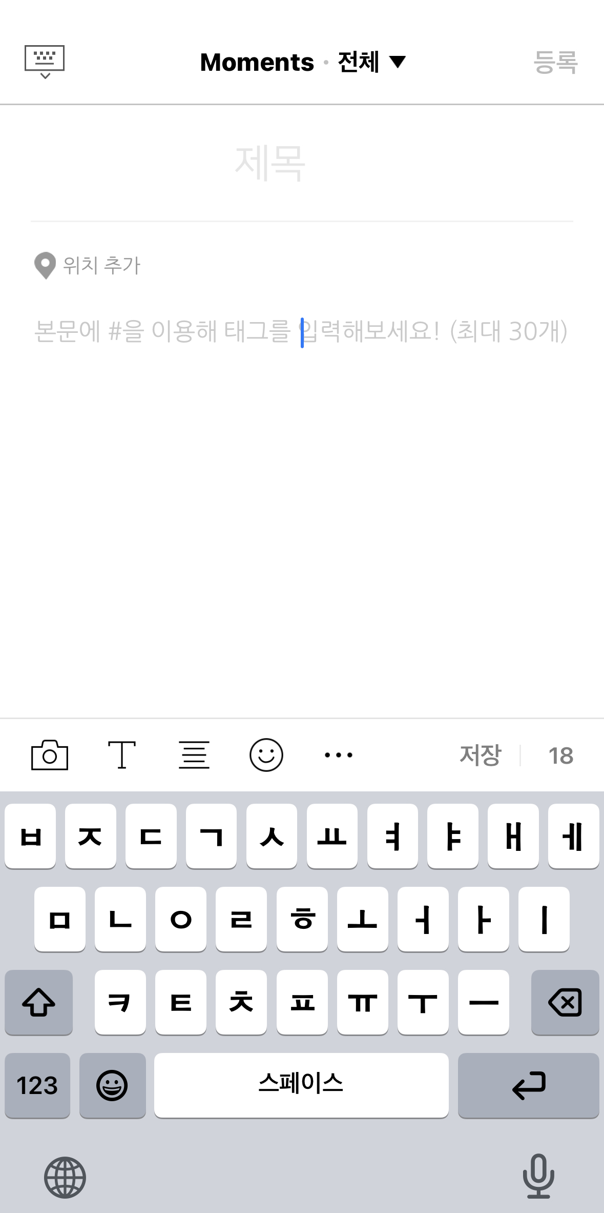 이렇게 네이버블로그 앱에서 글쓰기 화면으로 들어오면 위의 이미지와 같은 화면이 나오는데요. (아이폰 기준) 사진만 준비되면 모든 준비는 끝났다고 볼 수 있어요.