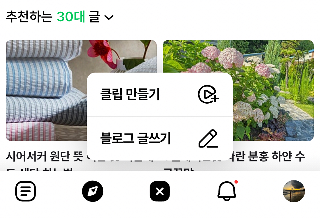 먼저, 네이버 블로그에 접속해주세요. 로그인은 당연히 해야겠지요? PC버전도 괜찮고, 모바일앱으로 접속하셔도 괜찮아요. 모바일앱으로 접속하시는 분들은 화면 하단의 [+] 아이콘을 클릭하신 다음, '블로그 글쓰기' 버튼을 클릭해주세요.