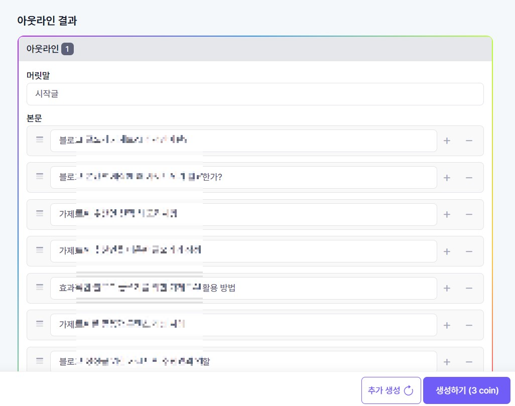 저는 3개 정도는 삭제하고 제 의도 맞는 목차만 남겨둔 다음 [생성하기 (3 coin)] 버튼을 클릭했어요. 일반은 2 coin인데, 조금 더 글자수가 많은 v2 버전은 3 coin 이더라구요. 가제트AI 추천코드를 입력해서 회원가입 했을 때 얻은 코인은, 이렇게 글을 생성할 때 이용하는 거에요! 그래서 무조건 추천드리는 부분 :)