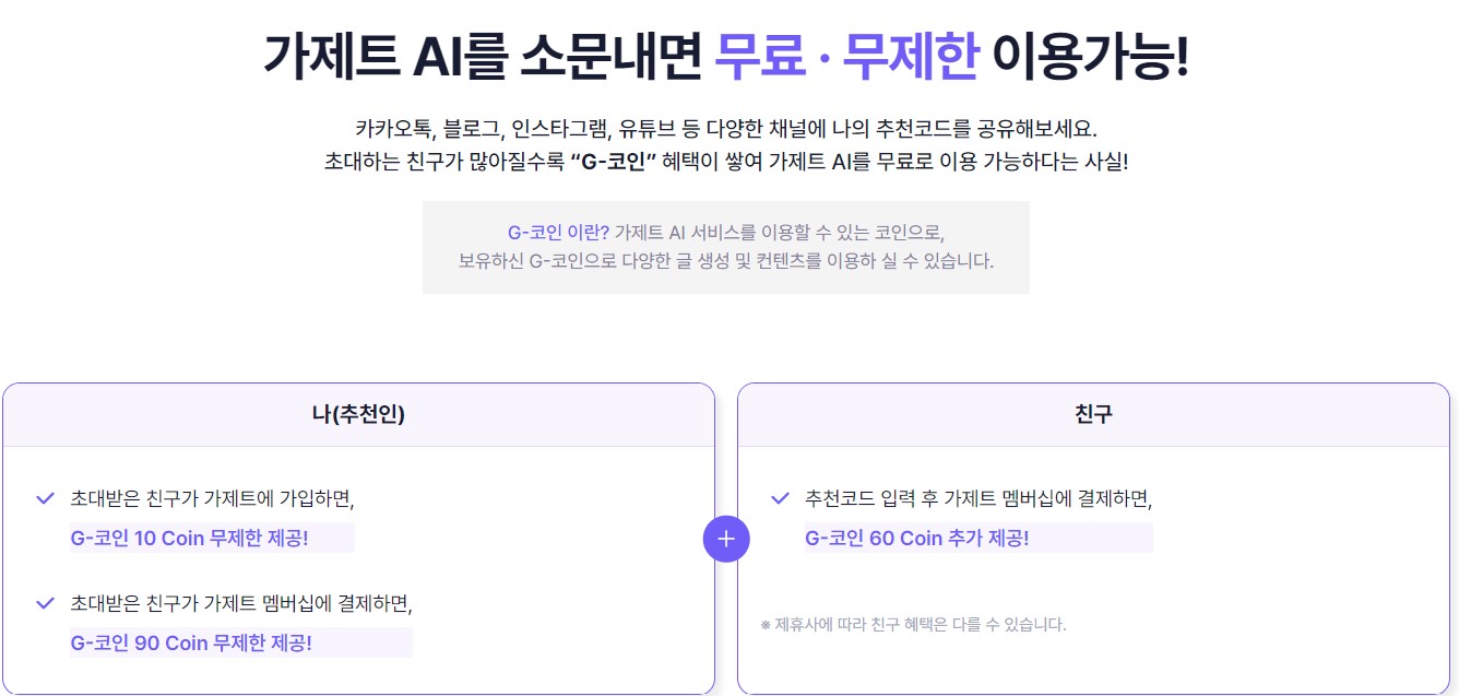 회원가입 시, 가제트AI 추천코드 입력하면, 글 생성 30회가 가능한 G-Coin 증정!