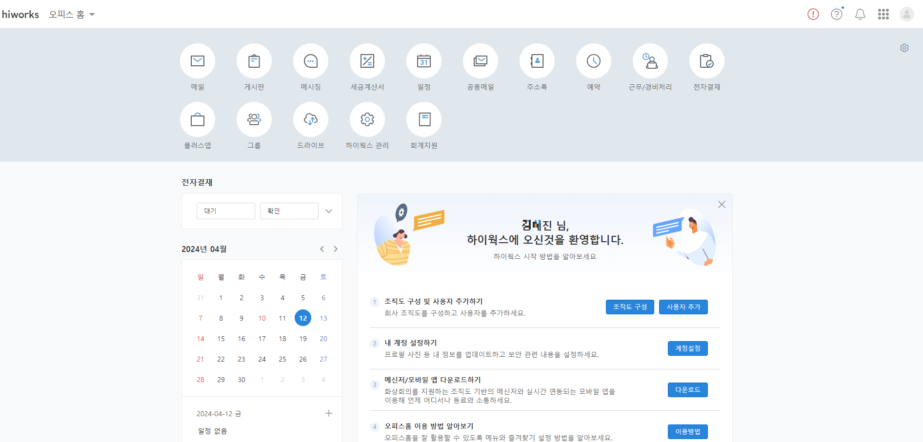 하이웍스를 신청할 땐, 오피스는 기본으로 들어가고 메일을 사용할 수 있는데요. 그룹웨어가 필요하다면 함께 사용할 수도 있어요. 전 회사 다닐 때 그룹웨어를 사용했었는데, 이렇게 보니 반갑더라구요.