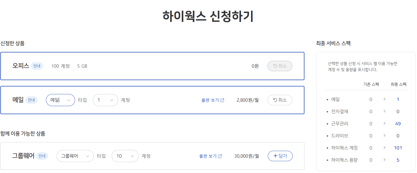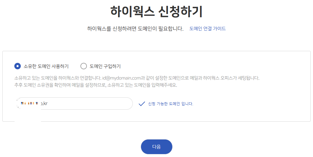 하이웍스 신청하기 (도메인 구매 후 이용가능)