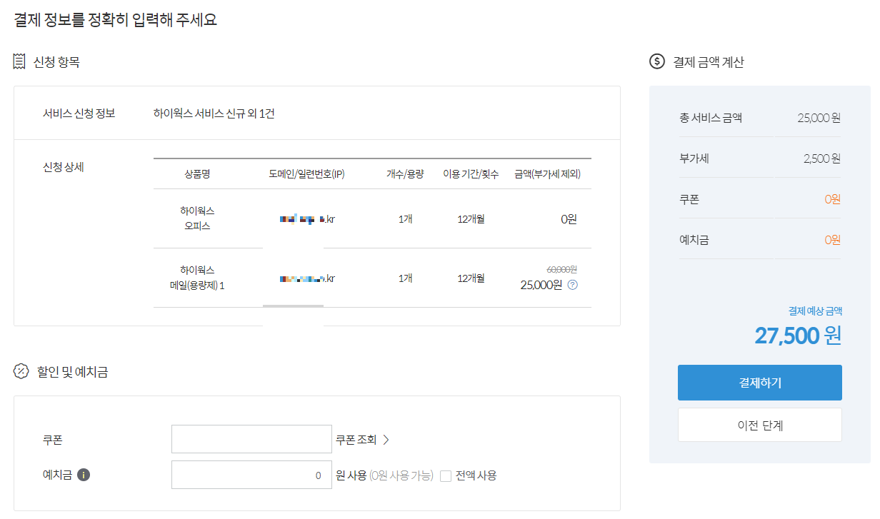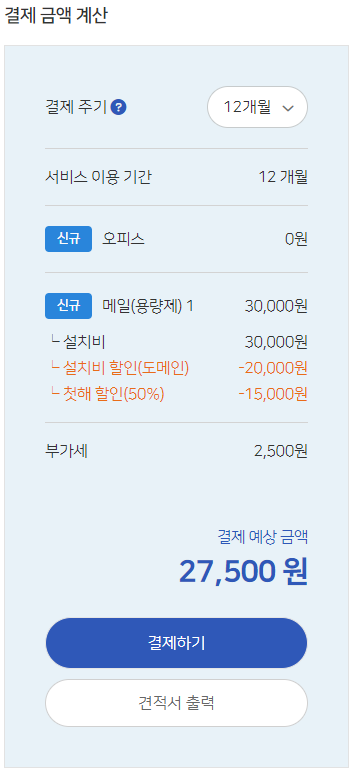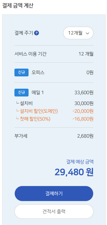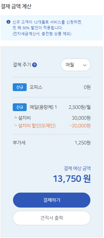 금액은 메일(용량제) 1이 조금 더 저렴했는데요. 12개월 기준으로 2천원 정도 차이나더라구요.