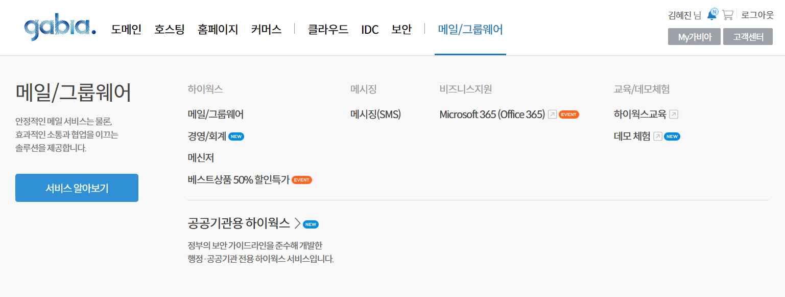 지난 포스팅에서는 가비아 도메인 구매하는법에 대해서 소개했는데요. 하이웍스 메일 이용을 위해서는 메일/그룹웨어에서 이용권을 구매해주셔야해요. 금액이 크지 않아서 구매하는 건 어렵지 않은데, 도메인만 구매하면 끝인 줄 알았더니 또 다른 작업이 필요한 게 정말 어려웠어요 ㅠㅠ