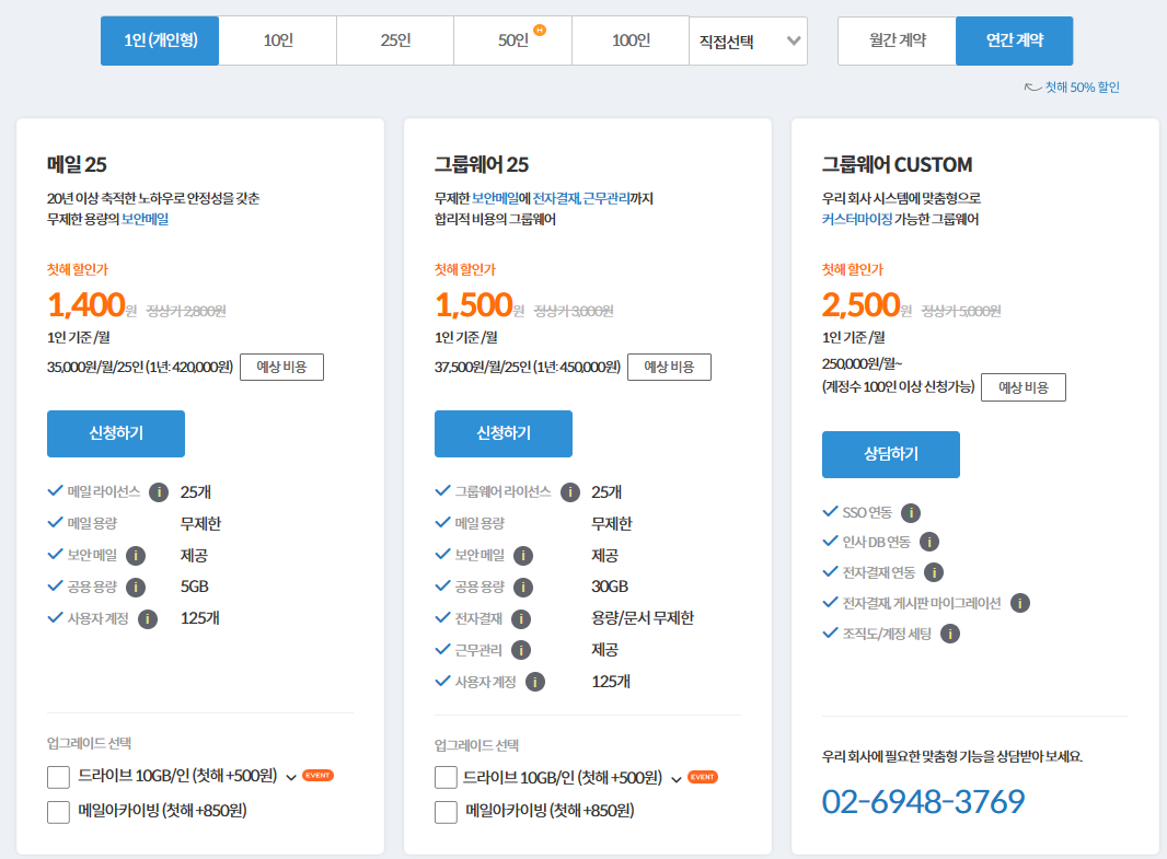 이용권은 회사 규모에 따라 비용이 달라지는데요. 저는 1인 기업이라 1인(개인형)으로 금액을 알아봤어요. 1인형도 이메일만 이용할 수 있는 메일25, 기타 기능이 탑재된 그룹웨어25, 그리고 가장 원하는데로 커스터마이징 할 수 있는 그룹웨어CUSTOM까지 종류가 다양하더라구요.