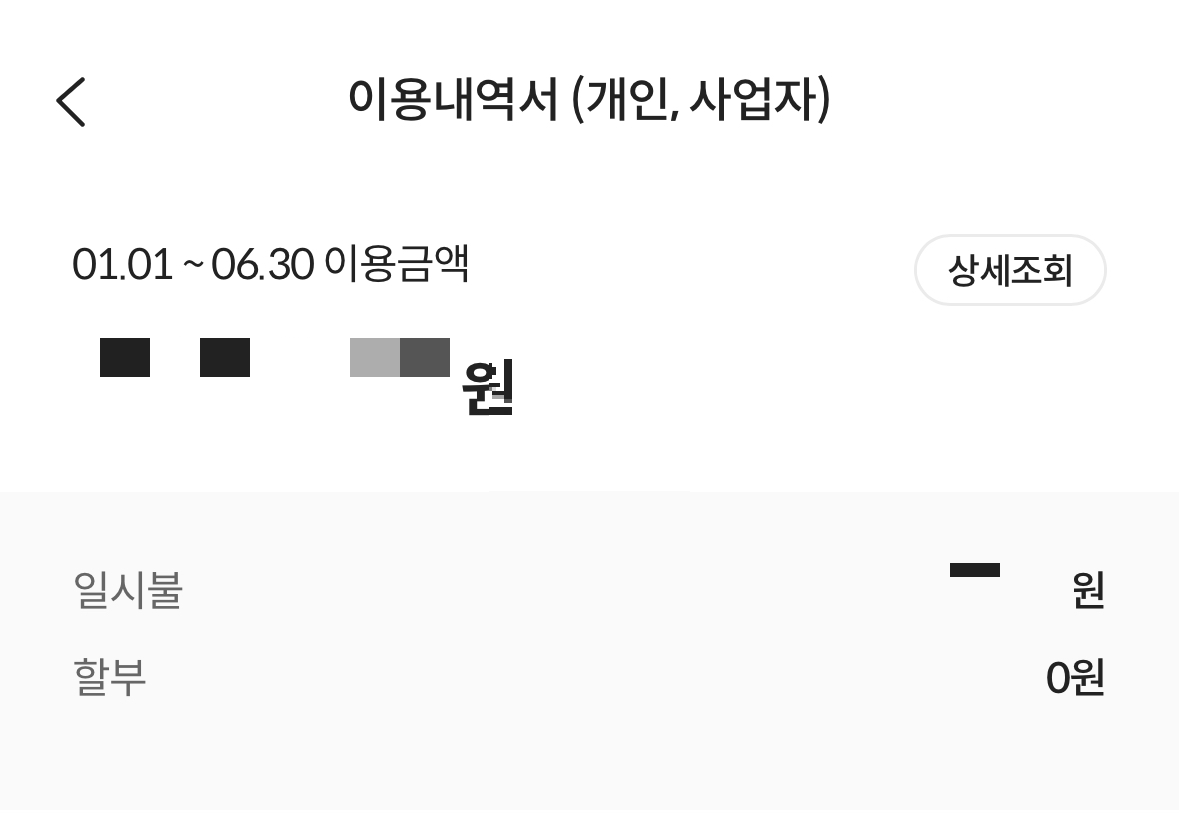 상반기 부가가시체는 해당년도 1월 1일 부터 6월 30일 까지 인데요. 날짜를 그에 맞춰서 설정하고, 상세조회를 하면 되더라고요. 개인적으로 롯데카드를 많이 사용하지 않아서, 이용금액이 백만원도 체 되지는 않았지만 .. 세무사 쪽에서 요청하셔서 자료를 발급받아서 넘겨드렸어요.