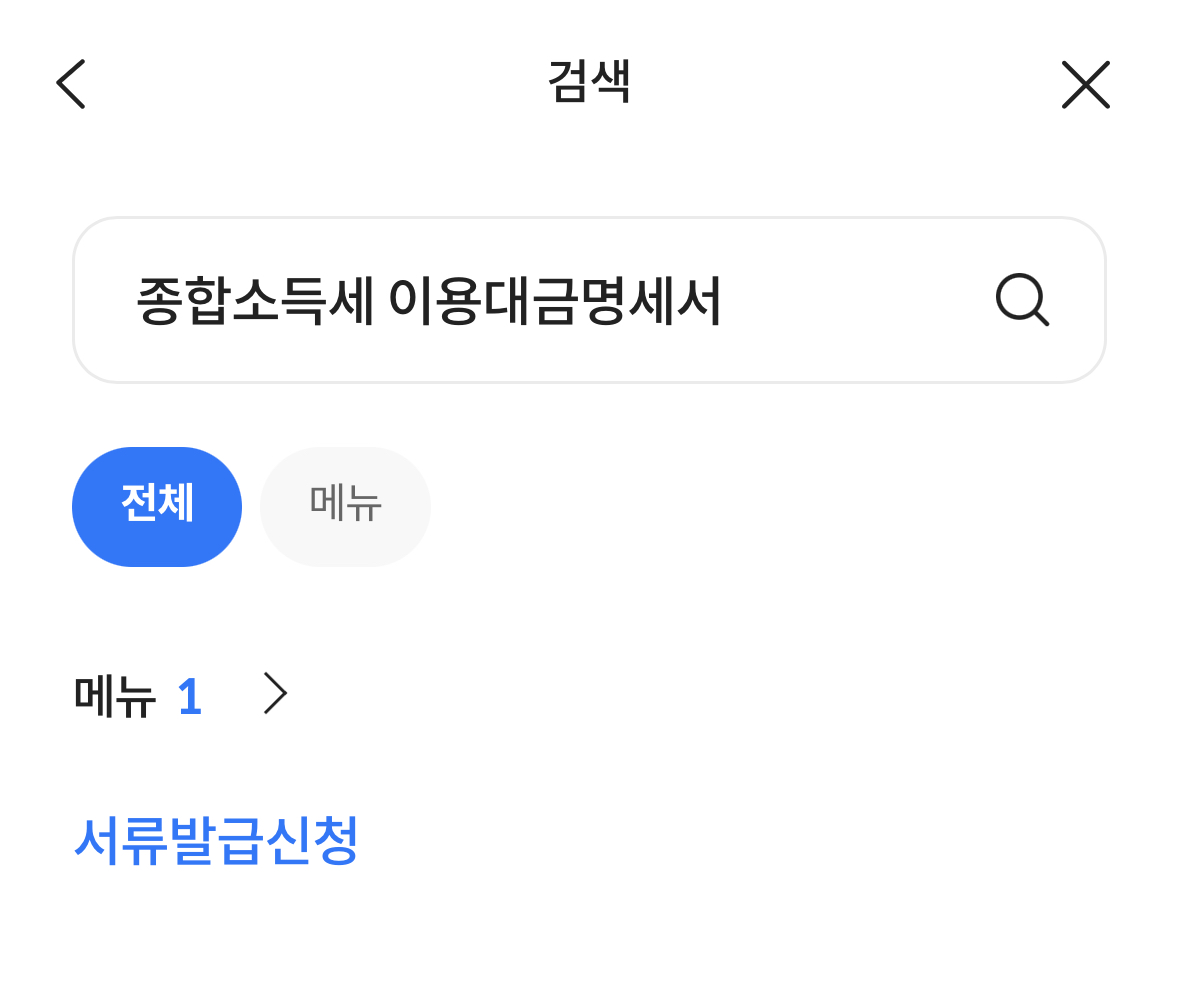 검색창에 '종합'만 입력해도, 다양한 메뉴가 검색되는데요. 롯데카드 사용내역 조회는 [종합소득세 이용대금명세서] 혹은 [종합소득세 서류발급]을 선택하면 되더라고요.